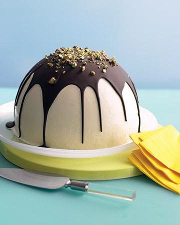 8.Make the topping: Place chocolate and shortening in a heatproof bowl set over a pot of simmering water. Stir until chocolate and shortening melt. Let cool slightly, then slowly pour on top of bombe, spiraling in concentric circles to create a solid center with long drips down the sides. Sprinkle pistachios on top, and freeze until chocolate is set, about 10 minutes.