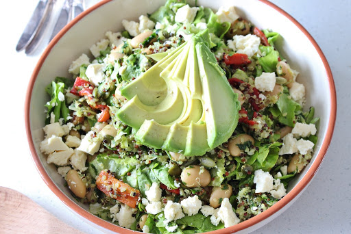 4.Thinly slice the avocado and place on top of the salad. Crumble feta over salad and serve.