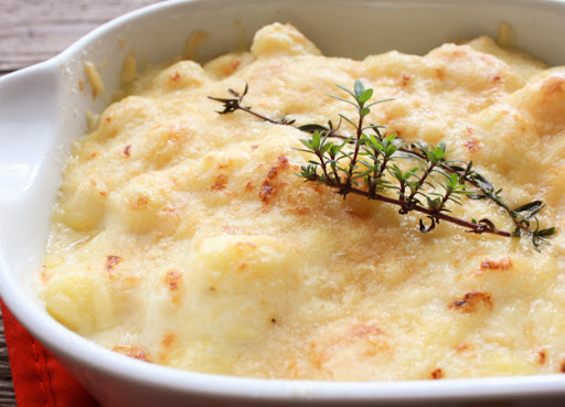 4.Place in baking dish, sprinkle with remaining Fontal cheese and Parmesan cheese, top with fresh thyme if desired. Bake for 3-5 minutes then broil for another 3-5 minutes. Let sit a couple of minutes before serving. Enjoy!