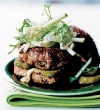 4. Meanwhile, mix arugula, jicama, remaining 1⁄2 teaspoon oil and the lemon juice in a bowl. Put rolls on plates and layer each bottom with 3 pickle slices, 1 tomato slice, a burger and 1⁄4 cup arugula-jicama salad. Cover with top of roll. Serve with condiments (if using).