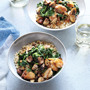 4. Add remaining 1 1/2 teaspoons oil to pan; swirl to coat. Add chicken to pan; sauté 4 minutes, browning on all sides. Add shallots, thyme, and garlic; sauté 1 1/2 minutes. Add wine and remaining 1/4 cup stock, scraping pan to loosen browned bits. Cook 2 minutes or until liquid is reduced by two-thirds and becomes slightly syrupy. Remove from heat. Add remaining 1 1/2 tablespoons butter, mustard, pepper, and remaining 1/2 teaspoon salt, stirring constantly until butter melts. Stir in mushrooms and spinach. Serve over quinoa.