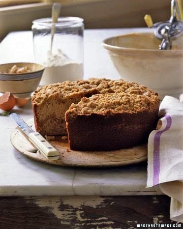 5.Spoon half of the batter into prepared pan. Sprinkle with 2 1/2 cups streusel. Top with remaining batter. Squeeze remaining streusel into large and small clumps; sprinkle on top of batter. Bake until golden brown and a cake tester inserted into center comes out clean, 50 to 60 minutes. Transfer to a wire rack; let cool 10 to 15 minutes. Remove cake from pan by slightly raising removable center piece; invert onto baking sheet, and then reinvert onto wire rack to cool completely.
