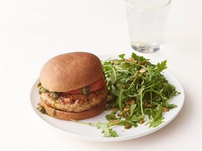 Serve the burgers on the buns; top each with a spoonful of pesto and a tomato slice. Toss the remaining pesto with the arugula, the reserved 1 tablespoon almonds and the lemon juice; serve with the burgers.