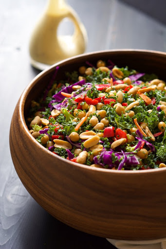 Salad: Toss all kale, red bell pepper, carrots, cabbage, broccoli and chickpeas together in a large bowl. Set aside.