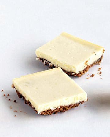 3.Pour the cream cheese mixture onto crust, and spread evenly with a rubber spatula. Bake, rotating sheet halfway through, until filling has puffed and feels slightly firm to the touch (do not let brown), 20 to 25 minutes. Let cool completely on a wire rack. Refrigerate, covered with plastic wrap, until set, about 1 hour. To serve, cut into bars. Bars can be refrigerated in single layers in airtight containers up to 2 days.