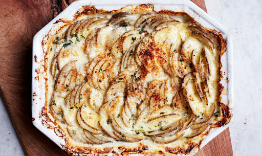 Arrange potato slices in prepared dish, fanning out a handful at a time and placing in dish at an angle (this ensures every scoop will have tender potatoes from the bottom and crisp edges from the top). Shingle as you work until bottom of dish is covered. Tuck smaller slices into any gaps to fill. Pour cream mixture over potatoes and cover dish tightly with foil. Bake potatoes until tender and creamy, 60–75 minutes. Let cool.