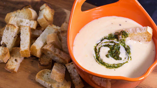 Spoon the pesto on top of the fondue and serve with toast strips. Dip the toasts in the hot cheese mixture, cutting off hanging strings with scissors, if desired, and enjoy. Remelt the fondue if the mixture becomes too thick for dipping.