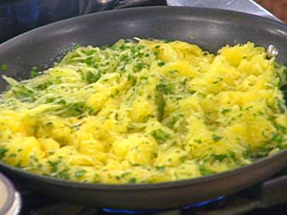 Heat a skillet. Add the butter, spaghetti squash, herbs, salt and pepper and toss thoroughly but gently to heat and combine. Serve immediately or cover and keep warm until ready to serve.