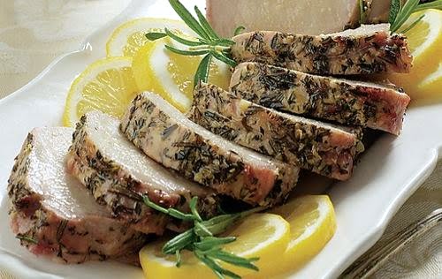 Tie kitchen string around pork in three places so it doesn’t flatten while roasting. Place salt and garlic in a small bowl and mash with the back of a spoon to form a paste. Stir in oil, rosemary and lemon zest; rub the mixture into the pork. Refrigerate, uncovered, for 1 hour.