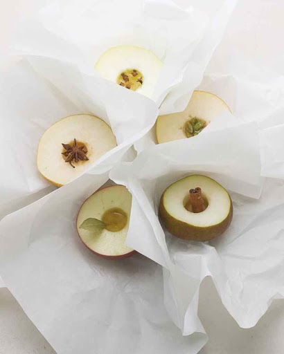 Place a pear half, cut side up, on each piece of paper. Working with one piece at a time, hold pear half in paper in the palm of your hand; gather edges of paper around fruit with your free hand. Transfer to a rimmed baking sheet.