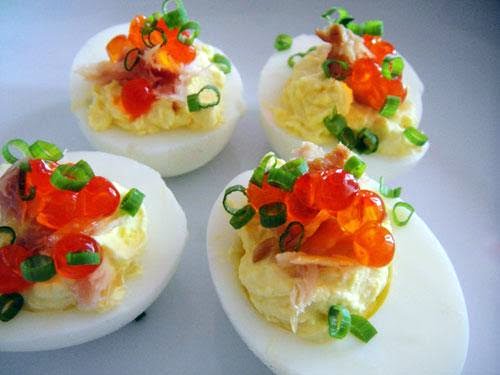 1. Place the eggs in a saucepan; fill with cold water to cover. Bring to a boil over high heat. Remove the pan from the heat, cover and let stand for 10 minutes. Drain the eggs, then plunge in ice water to cool. Peel and halve lengthwise.