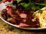 Slice the beef into very thin slices. Transfer to a platter and serve with the mushrooms, onions and gravy.