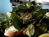 Take a platter and layer with goat cheese croutons. Top with mounds of feathery watercress and drizzle over the roasted tomato dressing.