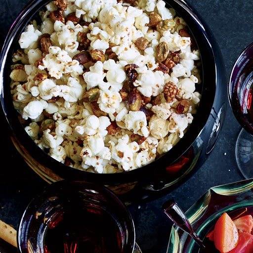 Mixing popcorn with glazed pistachios creates a sweet-salty snack that's fantastic with cocktails.