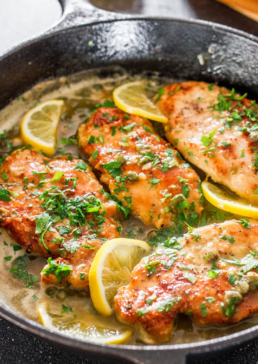 Remove skillet from heat. Add lemon juice, chicken stock or wine, capers and scrape up the brown bits from the pan for extra flavor. Return skillet to heat and bring to a boil. Taste the sauce and season with additional salt and pepper if needed. Add chicken back to skillet and simmer for about 5 minutes. Remove chicken to a platter and add remaining butter and whisk for about a minute. Sauce will thicken a bit.