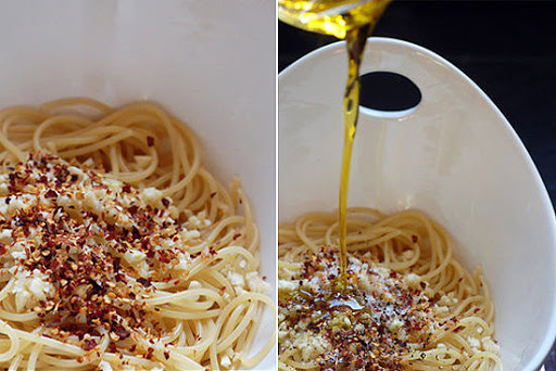 Add minced garlic, chili pepper flakes, olive oil, salt, and pepper, and mix together well.