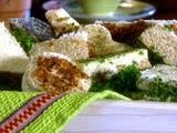 To assemble sandwiches, spread the fillings on top of white bread slices and cover with wheat bread slices. Cut each sandwich into triangles, squares or circles. Arrange on a large platter by sandwich filling. Garnish with parsley, bacon pieces, poppy seeds, or pecans. In gold ink, write each sandwich filling on a small card, attach it to a toothpick and place it in the center of each pile of sandwiches, identifying the filling.