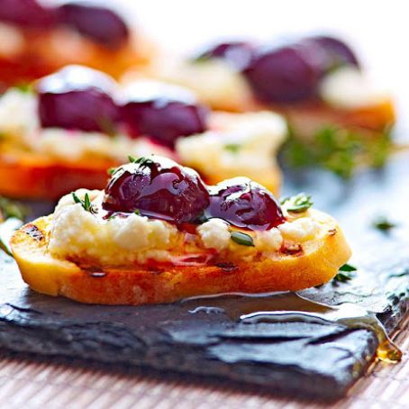 Transfer grilled bread to plate. Spread bread with goat cheese; top with 2 or 3 halved cherries. Drizzle with honey. Sprinkle with thyme leaves.