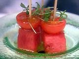 Place a tomato half on top of each watermelon cube with the flat side facing up. Poke a bamboo skewer through the top all the way down to secure the 2 items. Line up the skewers on a serving tray.