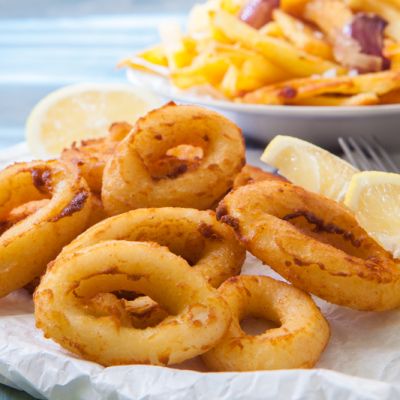 Slice up the onions. Put them into a bowl. In a separate bowl, pour the buttermilk. Meanwhile, heat the olive oil. In another bowl, stir the flour, baking powder, cayenne pepper and salt.