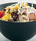 4. Add the beef mixture to the pasta; season with salt and pepper. Add the beans, tomatoes, sliced onion and vinaigrette and toss to dress. Top with the cheese.