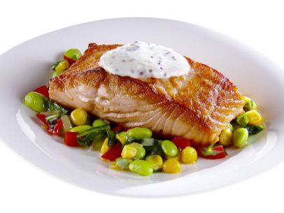 To serve: Spread 2 tablespoons of the sauce in a circle on each serving plate. Top with 1/2 cup of the succotash, and a salmon fillet. Serve with sauce on the side if desired.