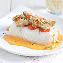 6. To serve, pour vinaigrette around fish. Garnish each fillet with warmed crisped artichokes and garlic, parsley, and tomato rounds. Serve immediately.