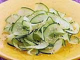 Peel cucumbers to leave alternating green stripes. Slice the cucumbers in half lengthwise; scrape the seeds out with a spoon. Using a food processor or sharp knife, cut into very thin slices. Place in a double layer of paper towel and squeeze gently to remove any excess moisture.