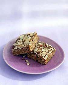 3.Spread mixture evenly in prepared pan (if mixture is very sticky, pat in with moistened fingers). Sprinkle with remaining 1/2 cup sliced almonds, patting in gently.