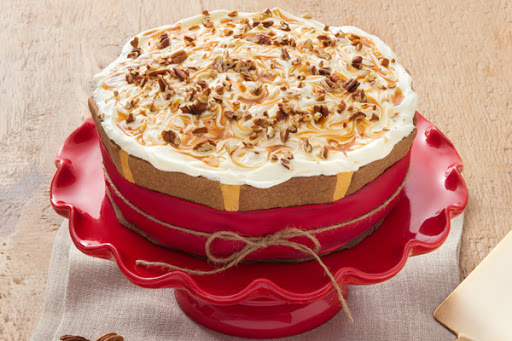 Surround cake with baked biscoff cookies and tie with ribbon. Decorate with pecan pieces and serve remaining sauce with cake slices.