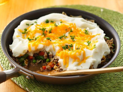 Meanwhile, make potatoes as directed on box for 6 servings. Spoon and gently spread mashed potatoes over pasta mixture. Sprinkle with cheese. Cover; let stand about 5 minutes or until cheese is melted. Sprinkle with parsley.