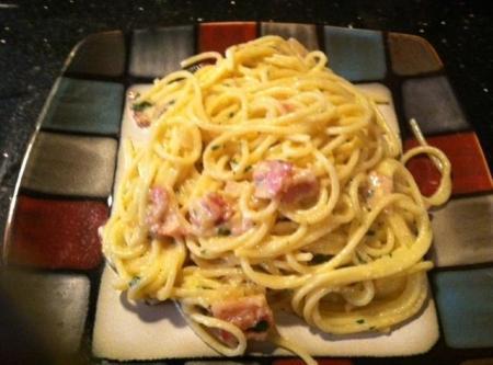 When the spaghetti is ready, drain and pour over eggs. Mix them well because the heat of the spaghetti is going to cook the eggs.