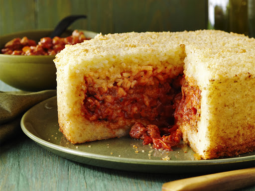 Run a small knife around the edge of the pan to loosen the timbale, then remove the side of the pan. Slide a spatula under the timbale and transfer it to a platter. Thin the remaining sausage filling with a splash of water and reheat. Serve with the timbale.
