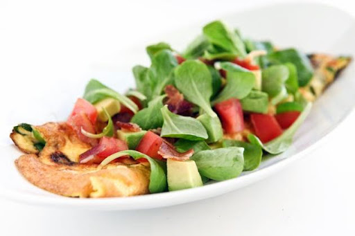4. Top the omelet with the chopped bacon, diced tomato, avocado and baby lettuce.