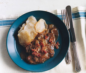 Add steaks with any meat juices and water and bring to a boil. Simmer, tightly covered, over low heat until meat is very tender, about 1 1/4 hours. If sauce is thin, transfer meat to a platter and boil until reduced to about 1 cup. Season steaks with salt and pepper. Serve with sauce and sprinkled with bacon.