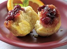 1. Heat oven to 400°F. Place cooling rack over sheet of waxed paper. Spray 12 medium muffin cups with cooking spray. Spoon 1 tablespoon cranberry sauce into each muffin cup. Top each with 1 teaspoon brown sugar.