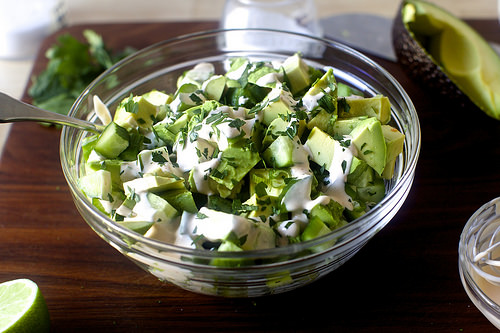 Combine cucumber, scallions and avocado in a bowl. Whisk together mayo, lime and seasonings, adjusting levels to taste. Drizzle salad with dressing and garnish with cilantro or parsley. Repeat again tomorrow.