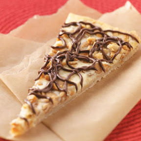 Bake for 15-18 minutes or until center is set. Cool for 15 minutes. Meanwhile, in a microwave, melt chocolate chips and shortening; stir until smooth. Drizzle over pizza. Refrigerate leftovers. Yield: 16 slices.