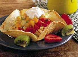 Heat oven to 400°F. Turn four 6-ounce custard cups upside down onto cookie sheet. Spray both sides of each tortilla lightly with cooking spray. Place tortilla over each cup, gently pressing edges toward cup. Bake 8 to 10 minutes or until light golden brown. Remove tortillas from cups; place upright on serving plates.