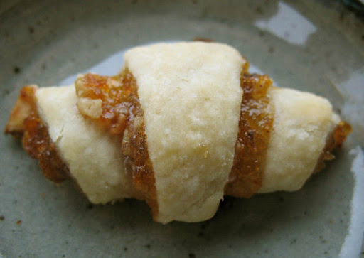 If you’ve ever made pizza, you can make rugelach, because all rugelach is, really, is dough rolled into a circle and spread with toppings. Pizza gets baked at this point whereas rugelach gets sliced and rolled into croissant-like shaped before going into the oven. Deensiebat’s rugelach is a cinch because you can make the soft, pliant dough in a food processor, then it’s just a matter of rolling it out, spreading it with apricot jam, walnuts and cinnamon sugar, and forming slices into crescents. The rugelach comes out tender and not too sweet, and while baking, some of the apricot juices seep out and caramelize on the parchment paper, giving the finished rugelach a candied edge.