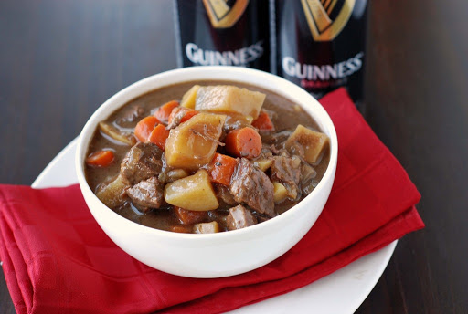 3) Place all ingredients in the crock pot, pour the stout over everything and let cook for low on 8 hours. If you like firmer vegis cook the beef in the stout for one hour & then add them.