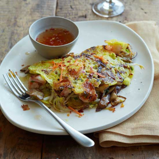 In a large nonstick skillet, heat 1 1/2 tablespoons of the vegetable oil over high heat. Add 3 slices of pork, 3 shrimp and a few slices of onion and mushroom. Season with 1/8 teaspoon each of salt and pepper. Cook for 1 minute. Stir the rice flour mixture again and ladle 1/3 cup into the pan; tilt the pan to evenly distribute the batter. Cover and cook until the sides of the pancake turn deep brown and curl up, 5 minutes. Scatter 1/4 cup of the bean sprouts over the pancake, fold it in half and slide it onto a warm platter. Keep warm in a low oven while you repeat with the remaining ingredients. Serve the pancakes warm, with the dipping sauce on the side.