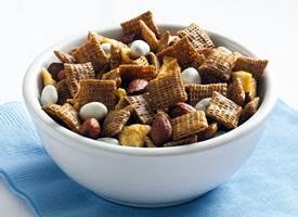 In large microwavable bowl, mix cereal and almonds. In 2-cup microwavable measuring cup, microwave butter, brown sugar, corn syrup and cinnamon uncovered on High about 2 minutes, stirring after 1 minute, until mixture is boiling; stir. Pour over cereal mixture, stirring until evenly coated. Microwave uncovered on High 3 minutes, stirring and scraping bowl after every minute. Stir in apples; microwave uncovered on High about 2 minutes or until apples just begin to brown on edges. Spread on waxed paper or foil to cool, about 5 minutes. Place in serving bowl; stir in raisins. Store in airtight container.