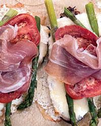 These open-faced sandwiches with crisp asparagus, prosciutto and three layers of melted cheese are gooey and crunchy.