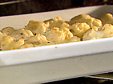 Pour 1/3 of the sauce on the bottom of an 8 by 11 by 2-inch baking dish. Place the drained cauliflower on top and then spread the rest of the sauce evenly on top. Combine the bread crumbs with the remaining 1/4 cup of Gruyere and sprinkle on top. Melt the remaining 2 tablespoons of butter and drizzle over the gratin. Sprinkle with salt and pepper. Bake for 25 to 30 minutes, until the top is browned. Serve hot or at room temperature.