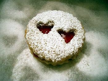 Simple butter and sugar cookie dough, baked into precious heart shapes. One half gets a smear of raspberry preserves and then is topped with a top cookie. Dust with confectioners sugar or dip in melted semi-sweet or white chocolate. These are also good filled with lemon curd, Nutella, dulce de leche, melted chocolate, peanut butter, or apricot preserves. Dollar stores have great heart tins to pack these into.