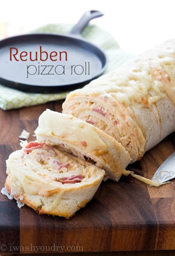 Unroll the Pillsbury pizza dough on a greased baking sheet. Press to about 14 inches x 9 inches. Bake for 8 minutes then remove from oven. Spread the ¼ cup of thousand island dressing over the crust, all the way to the edges. Top with the chopped corned beef, drained sauerkraut, and 2 cups of Swiss cheese. Carefully roll up the pizza into a tube. Place the pizza roll into a 9x5 inch loaf pan, seam side down.