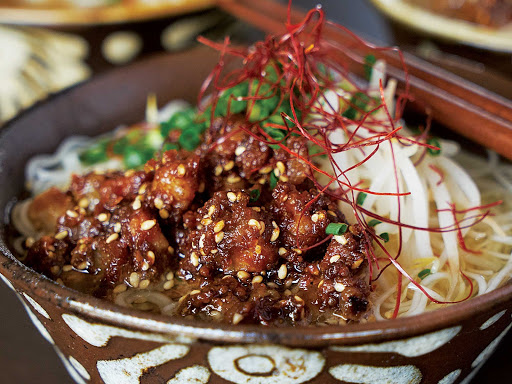 In a medium bowl, toss the cooked pork with the miso, awamori, mirin, sugar, and 3 tablespoons water until evenly coated. Scrape the pork and sauce into the skillet, return it to medium heat, and cook, stirring, until the liquid reduces and the pork becomes sticky, about 10 minutes.