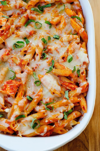 Spread the pasta in a 9x13 inch casserole dish and cover with foil. Bake at 350 degrees for 30 minutes. Remove from the oven and uncover and top with remaining cheeses. Bake for about 10 minutes until cheese is melted and casserole is heated through. Garnish with chopped basil if desired.