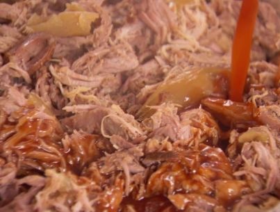 Place the pot on the stove over medium-high heat and add 1/2 to 1 cup of hot water. Scrape the pan to loosen up the bits and cook for 5 minutes to reduce. Pour in the barbecue sauce and stir to heat.